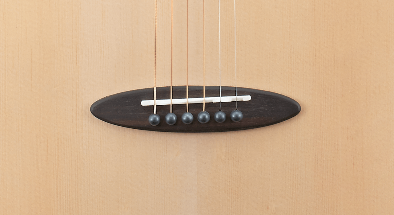 The oval-shaped rosewood bridge helps support the string tension. The Synthetic Bone for the nut which is very hard and articulate. This helps the strings to vibrate and to have a deep resonance.