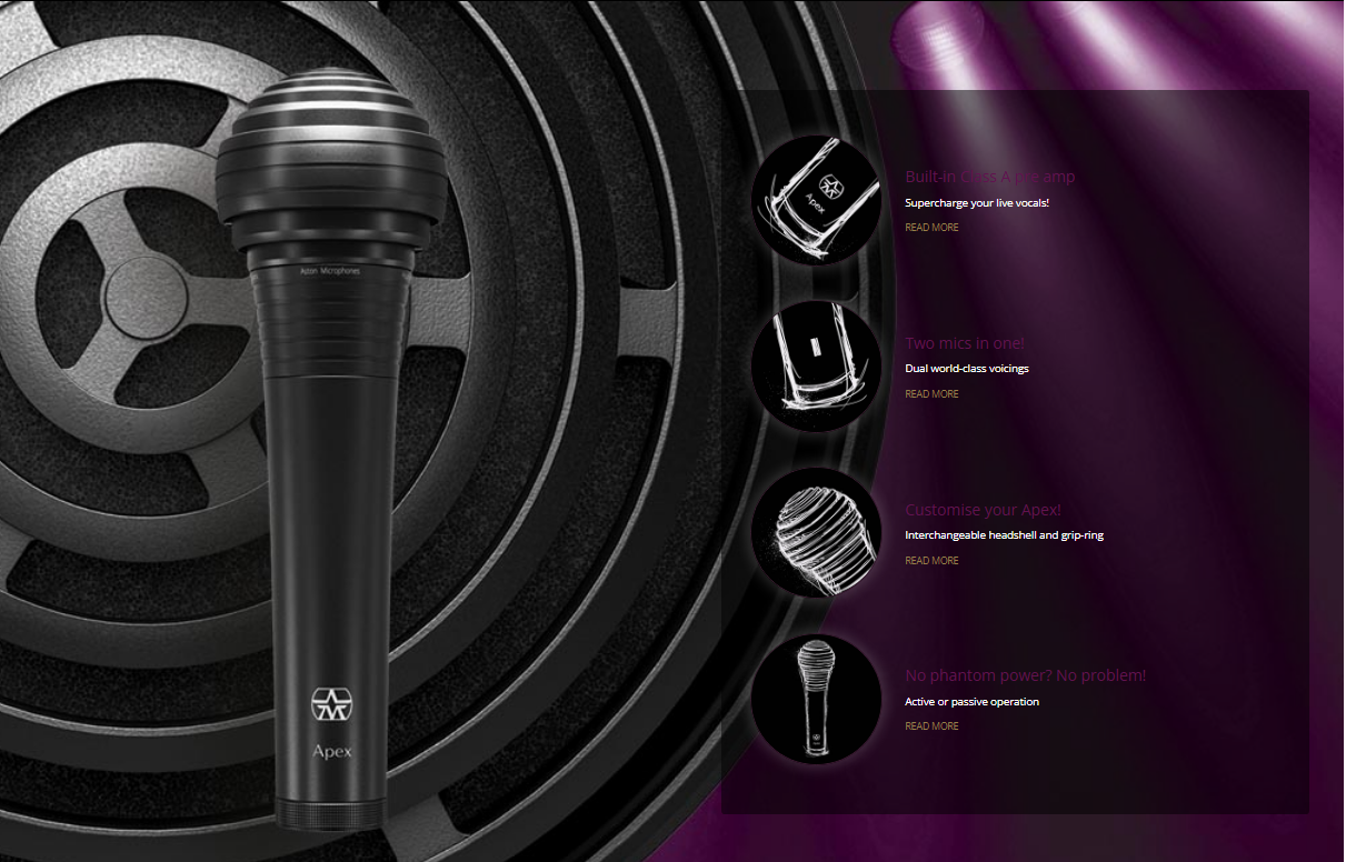 Firstly, there’s a choice of two voices, derived from the TEC Award-winning Aston Stealth. These are discrete signal paths, with no EQ presets or modelling in sight. You get a choice of two world-class vocal voicings without having to swap mics out. Secondly Apex operates in passive or active modes; a built-in Class A preamp engages automatically when 48v phantom power is present, providing 20dB of super-clean boost to ensure live vocals cut through the mix live, just as they do on the studio recordings. An aerodynamically tuned head further enhances on-axis focus..