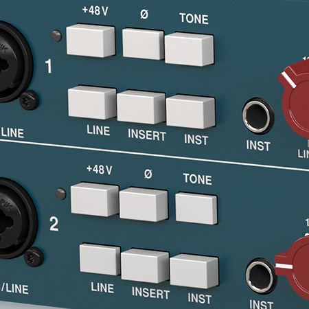 Dedicated Phase, Tone, Insert, Line, Instrument, and Phantom Power switches for each channel