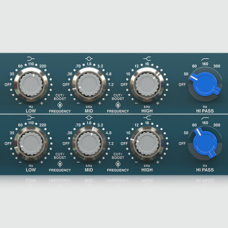 Taking a closer look at the 3-band EQ section, low frequencies can be set at 35, 60, 110 or 220 Hz; mid frequencies at 360, 700, 1600, 3200, 4800 or 7200 Hz; while highs can be set at 10, 12 or 16 kHz. This section and its inductor based rotary switches and are key to bringing out that lush, vintage sound in any mix. Combine this with the 5-position high-pass filter with selectable 50, 80, 160 or 300 Hz settings and you can get really creative, vocals can be made more intimate and present, guitars given a warm, woody sound, and bass tracks the thump and funk they deserve. Having fixed frequency settings and the ability to finely boost or cut specific frequencies is also very helpful in recreating configurations precisely.