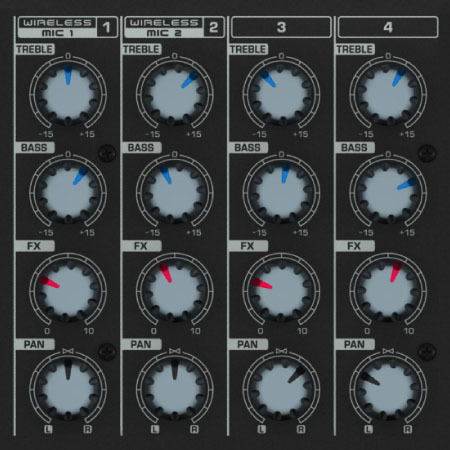 Channels 1 – 4 feature our high-quality “Invisible” Mic Preamps (IMP), which have been praised for their transparency and headroom. A Level control is provided with a Clip LED, so you can dial in the perfect signal level. We' ve also provided a Pad switch for those occasions when you have to contend with “hotter” than normal input levels. Additionally, each channel has its own dedicated two-band EQ (Bass and Treble), Pan or Balance-allowing you to place the signal wherever you want within the stereo image-and an FX level control.