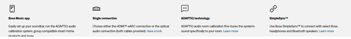 For a soundbar to come closer to creating a cinematic experience, it has to do more than just point sound in different directions. The Bose Smart Soundbar 900 with Dolby Atmos® goes well beyond that, adding a unique layer of realism. Exclusive Bose technologies elevate all content by separating instruments, dialogue and effects, placing them in discrete parts of a room – far left, far right, overhead – for immersion like you’ve never felt before.