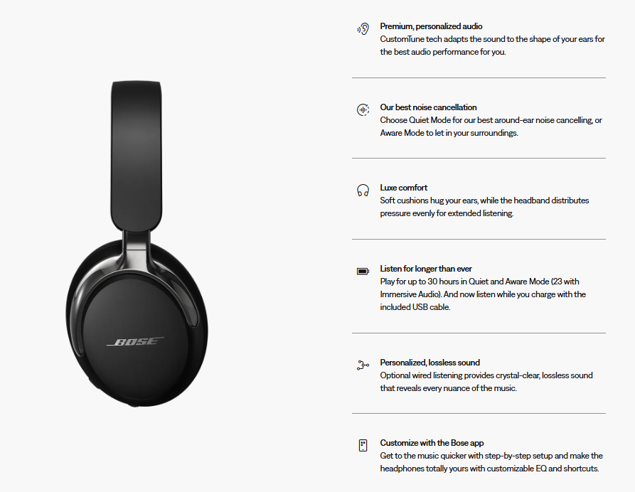 Obsessively engineered with our best noise cancellation and spatialized audio for immersive listening, the QuietComfort Ultra Headphones (2nd Gen) make every note expand, every piece of dialogue hit harder, and every melody take up more space. They’re crafted with luxe materials for unrivaled comfort and premium design, letting you sink deeper than ever into your favorite songs and video content.