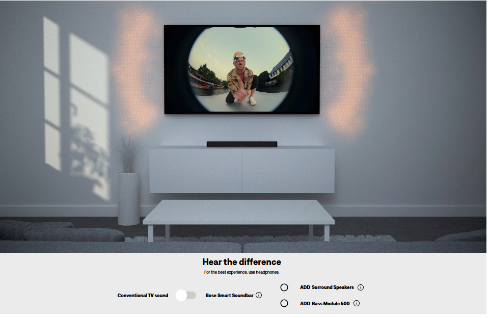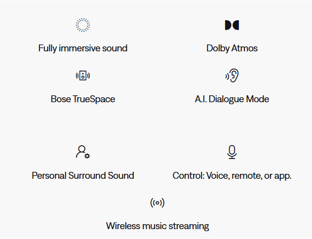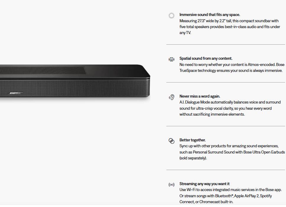 Dolby Atmos, exclusive Bose TrueSpace technology, and upward-firing transducers deliver shockingly immersive sound for a soundbar of this size.