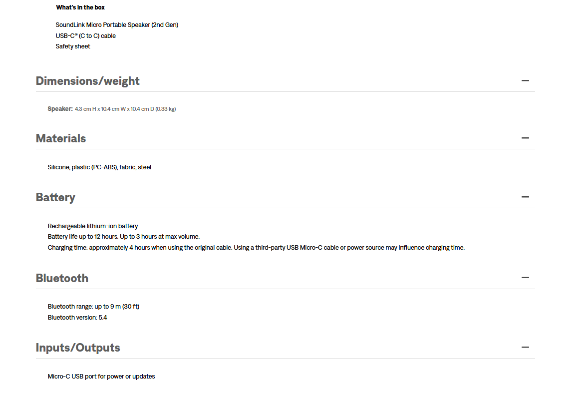 Cue the connection with the back and better-than-ever SoundLink Micro (2nd Gen). Deceivingly small, this portable powerhouse can fit in the palm of your hand, yet still deliver up to 12 hours¹ of crisp sound. This tiny but tough speaker plays rain or shine and is powerful enough to break any silence, anywhere.
