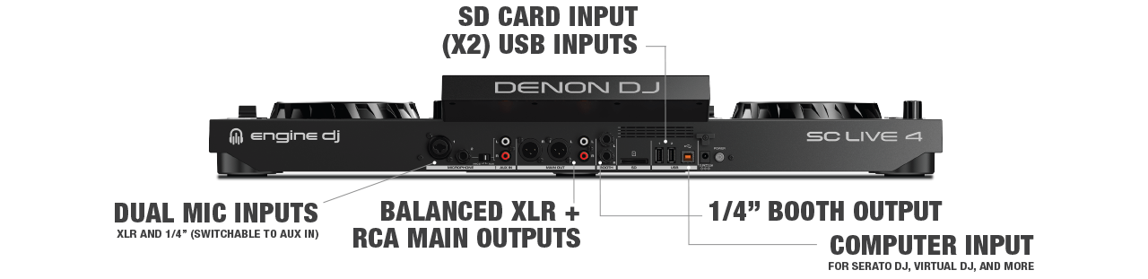 Computer Mode allows the SC LIVE 4 to be used as a full-featured DJ software controller for Serato DJ (Pro license included) and Virtual DJ (additional license required.)