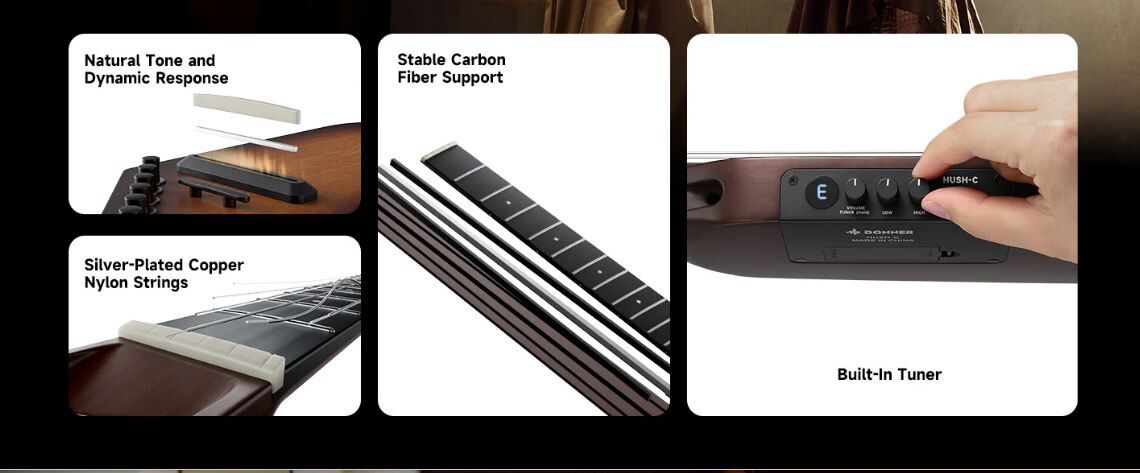 Premium Craftsmanship Meets Modern Aesthetics:Crafted with okoume woods, a neck-through design, and carbon-fiber-reinforced neck, the HUSH™ C Nylon Acoustic Electric Guitar offers rich resonance and lasting stability. A natural bone nut, abalone inlays, and tool-free roller truss rod add pro-level tone and convenience.