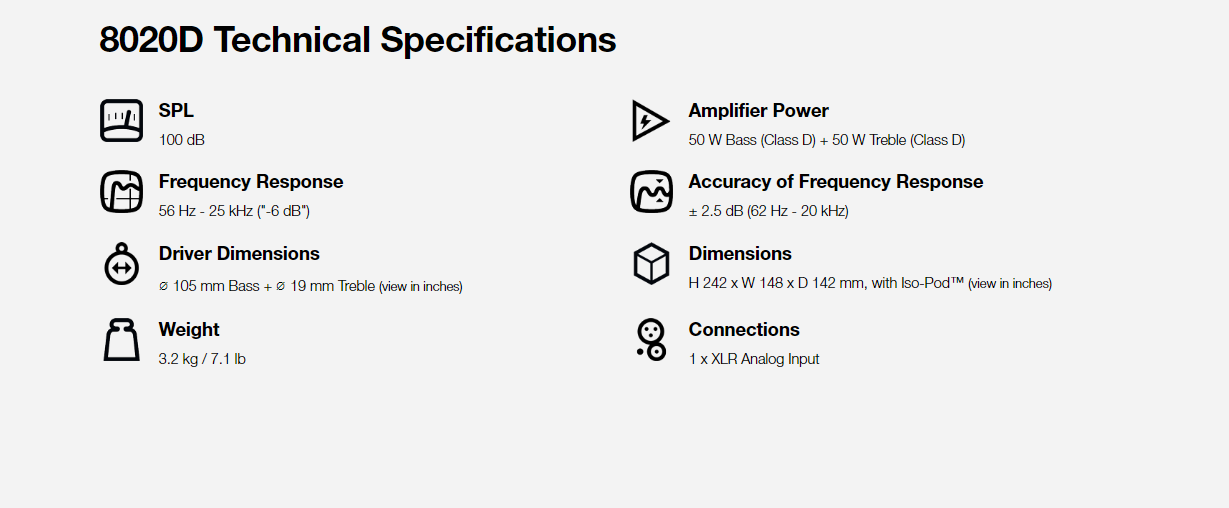 The 8020D is the latest revision of this enduring studio classic, boasting an even higher SPL yet lower energy consumption than previous versions. Designed to adapt to the broadest possible range of listening environments, the 8020D thrives when space is at a premium.