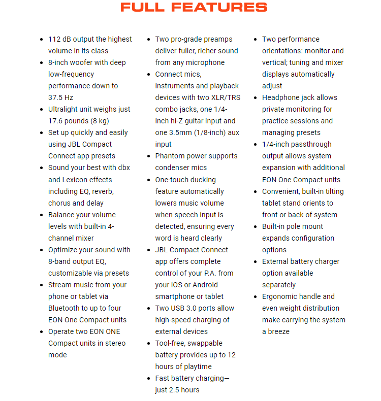 The days of sacrificing sound system power and performance for portability are over. The JBL EON ONE Compact packs a professional-grade speaker, a full-featured 4-channel mixer and Bluetooth control into our most compact battery-powered PA, weighing in at just 17.6 pounds. Sound your best in seconds with premium effects and presets that you can customize right on your phone or tablet using the JBL Compact Connect app—no engineer needed. Presenters, fitness instructors and emcees will appreciate EON ONE Compact’s ducking feature, which lowers background music volume when speech input is detected. Peer-to-peer Bluetooth lets you broadcast music playback. And with the EON ONE Compact’s tool-free, swappable 12-hour (max) battery, you’ll keep the party going long after the sun goes down. Whether you’re a singer/songwriter, DJ, presenter, fitness instructor, or you just want to enjoy amazing sound on the go, get ready to #PlayAnywhere with JBL EON ONE Compact.