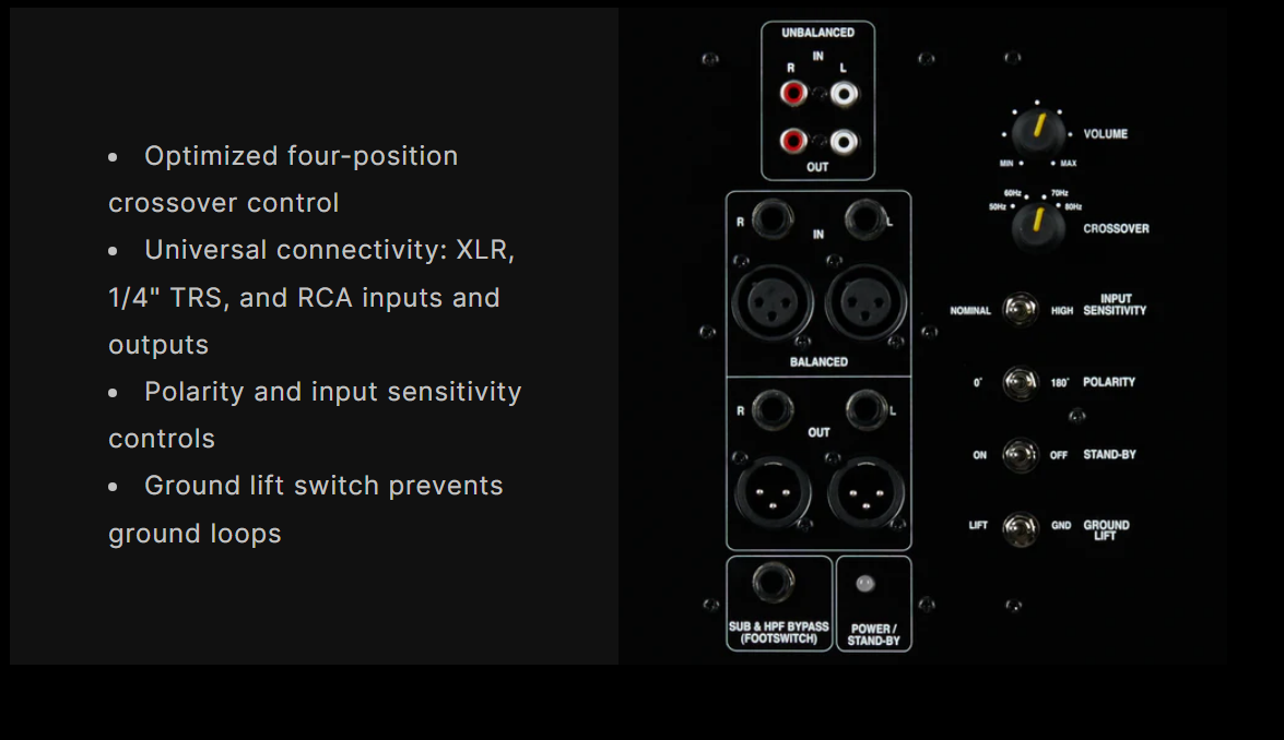 Mix with confidence. The bypass footswitch control allows you to quickly mute the sub and send full-range audio to your recording monitors.