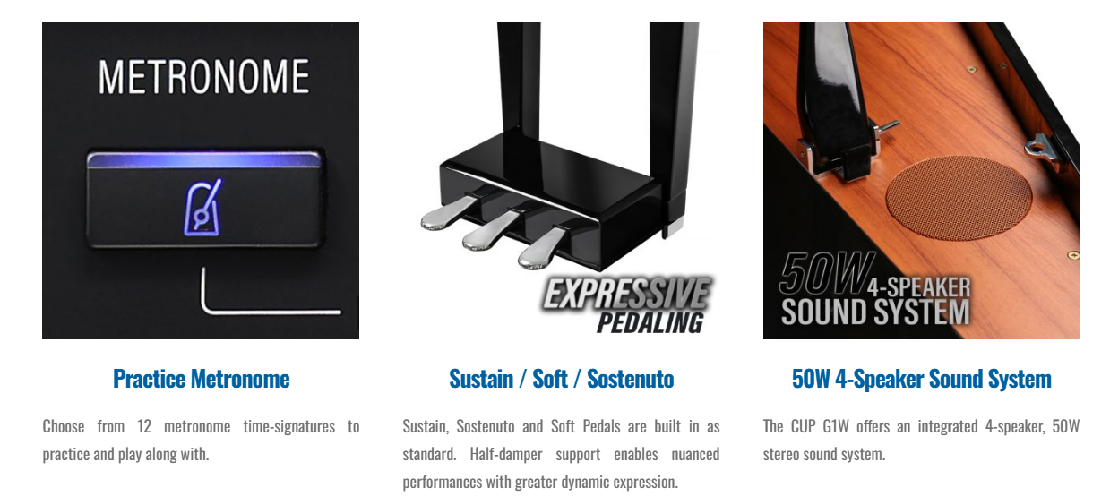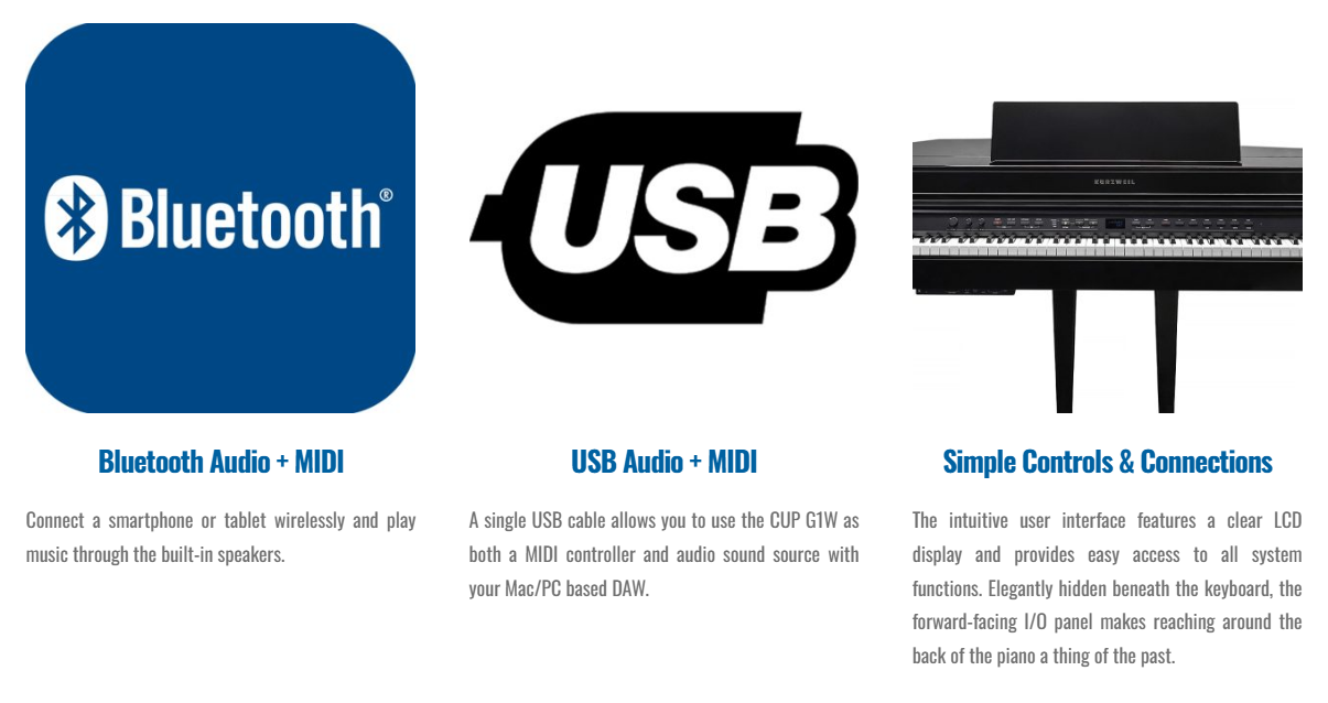 Leveraging Kurzweil’s pro-level synthesizer technology and industry-leading samples, the CUP G1W provides the rich feel of a German D Concert Grand.