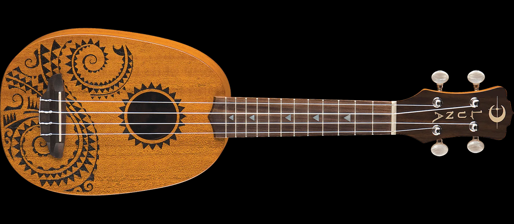 Luna's Tattoo Soprano Pineapple ukulele pack takes its design from traditional Hawaiian body ornamentation. Through a scared inking process, designs were monochromatic. Patterns and layout were strongly geometric and there were many shapes and symbols which represented the natural island world:stones, waves, fish, sharks, turtles, rain, sun, birds. This design is primarily based on waves and sharks teeth which are also echoed as the fret markers. With an all eastern mahogany body and walnut fretboard, this Soprano uke resonates with a warm tone. This Luna Tattoo Pineapple uke package is equipped with everything you need, including a tuner, chord chart and a branded gigbag for traveling. Join the Luna Tribe!