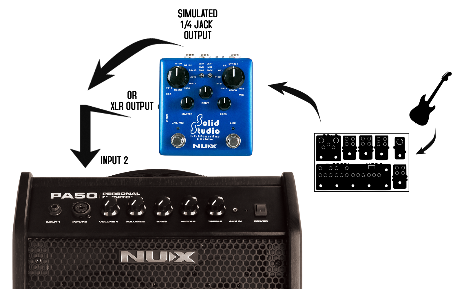 Channel 2 is totally FLAT with a great accuracy and designed for direct compatibility for an IR loader such as NUX Solid Studio. And you can take the advantage of using the sound (profile) of any guitar amplifiers everywhere.