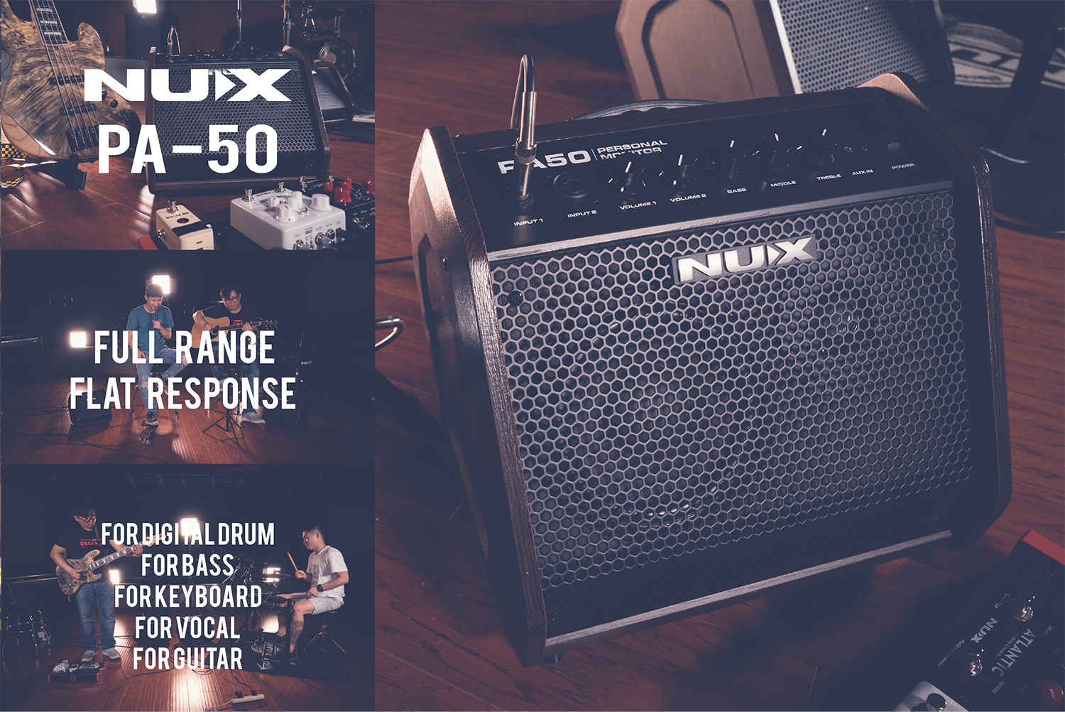 NUX PA-50 personal monitoring amplifier has a flat frequency response and is equipped with a full range dynamic speaker and the input of each channel has independent EQ curve.