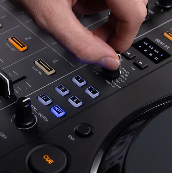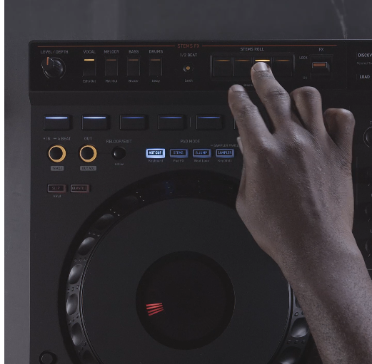 The DDJ-GRV6 is compatible with Serato DJ Pro, which includes a Stems FX feature. Express yourself musically by applying effects such as Roll, Trans, Echo Out, and Delay to the separate Stems of a track – drums, bass, vocal, or melody. Apply the overlay sheet included with the DDJ-GRV6 to change the button labels to Stems FX for ease of use.