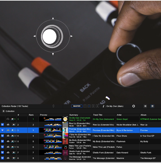 The new Smart Rotary Selector on the DDJ-GRV6 allows for up/down and left/right tilting as well as conventional rotation and push operations when using rekordbox for Mac/Windows ver. 7. The left/right tilt enables intuitive navigation through the media browser, tree view, and track list, while the up/down tilt allows fast navigation through playlists and collections, so you can quickly find the track you want, no matter how big your music library is.