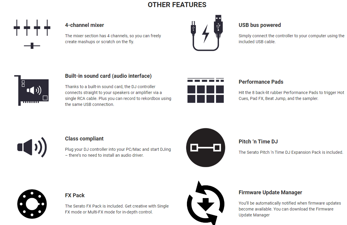 VirtualDJ is compatible with the updated unit (licenses available separately), which offers free compatibility with rekordbox and Serato DJ Pro. The DJ controller also comes with license keys for the Serato FX Pack, Pitch 'n Time DJ Expansion Packs and TRAKTOR PRO 3 TSI file, which will be released.