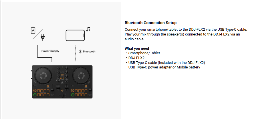 The DDJ-FLX2 is our lightest and most compact DJ controller. It runs on USB bus power, so there’s no need for an external power supply when you connect it to a PC/Mac or a mobile device* via USB Type-C. You can start DJing easily by playing music through the built-in speakers of your PC/Mac/mobile device. Or, if you plug speakers into the audio output terminals of the DDJ-FLX2, you can throw a loud party with friends.
