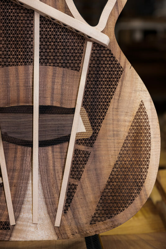 The result of that focus, the TRU bracing system (for “Total Resonating ‘Ukulele”), debuted in 2006 and utilized a traditional fan pattern with weight-reduced spruce braces that were attached strategically to allow for more soundboard movement. We revised the design with the aid of laser technology in 2017 with TRU-R bracing, reducing the weight of the bracing by 30% without sacrificing durability. 2021 saw the introduction of TRU-Relief, TRU-Reduction, and TRU-Support, allowing for a radical new contoured soundboard for unparalleled player comfort.