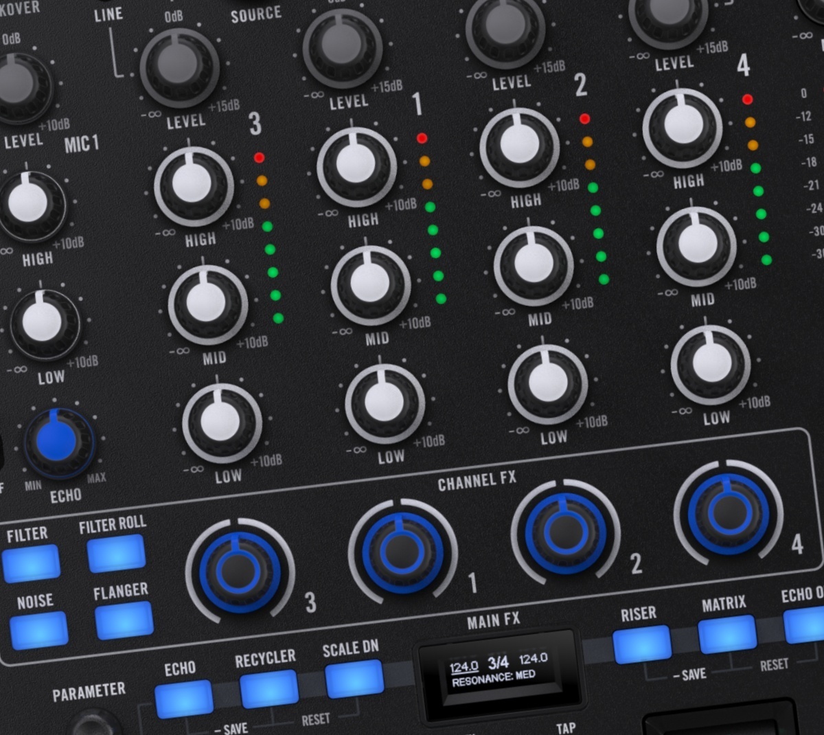 4-Channel mixer with full EQ control, intuitive FX assignment, enhanced Sampler routing and quick-access jog wheel deck selection buttons and 2 external Line/Phono ins for external turntables or decks