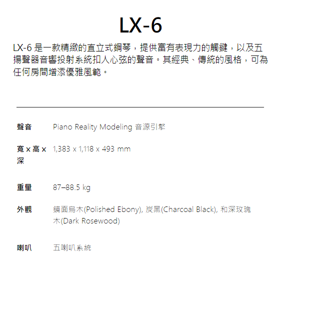 A Tapestry of TonesThe LX-6 provides a vast range of tonal variation and expression that naturally responds to your performance. Play softly for a stately, mellow tone. And as you crescendo, the tone responds to your dynamics with brightness. When emotion and technique flow through your fingers, the LX-6 reflects that passion.