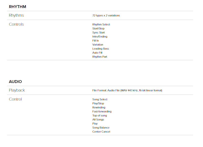Sophisticated onboard Rhythm feature with intelligent accompaniment (72 different rhythm styles, including 6 pianist styles)