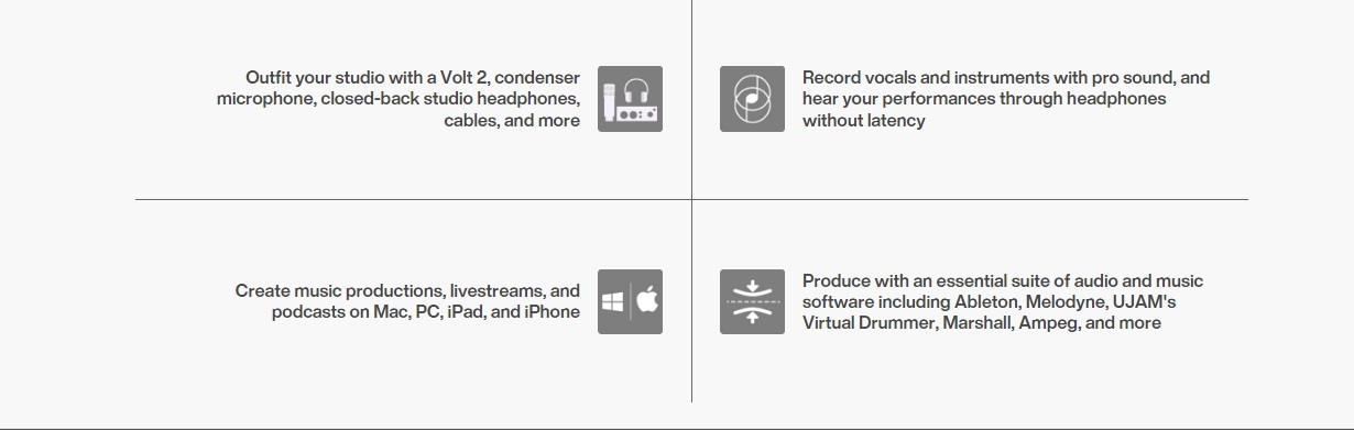 The Universal audio Volt SB2 is the perfect way to start recording your music from home. From Music production, livestreams and podcasts, the Volt SB2 from Universal Audio is everything you need in one bundle to achieve high quality results. The bundle features the Volt 2 2-in 2-out audio interface, a condenser microphone and cable, and studio monitoring headphones. The Volt 2 USB audio interface features a vintage mode which allows you to record with the characteristics of the classic UA 610 tube preamp. This compact, portable interface features 24 bit/192kHz conversion, one headphone output, connectivity for mac/PC and iPad/iPhone, direct monitoring for latency-free recording. The Volt 2 also features outputs for monitors and a single midi in and out.