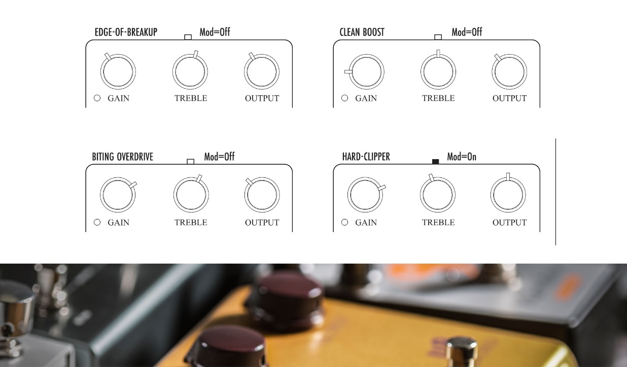 Whether you’re after the fabled boost tones, edge-of-breakup overdrive, or you want to push your rhythm channel to true grit - the Centavo has all of the adored tones of the original pedal. The Centavo is comfortable acting as a boost pedal, but the saturation in the higher gain settings provide a platform for true “transparent” overdriven rhythm tones. The addition of the “MOD” switch on the back - famously requested by Jeff Beck on the original pedal- allows players to extend the bass response, impacting the lower strings to get added low end drive tones.