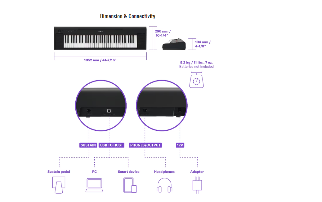 The 61-key keyboard (a conventional piano has 88 keys) is perfect for playing pop tunes or simple classical pieces. Although the keys have the same box shape as those on a piano, the keyboard has a lighter feel that makes it easy for beginning pianists to start, rather than the weightier feel of a standard piano keyboard. You can also use headphones with the NP-15 if you are worried about disturbing those around you with your playing.