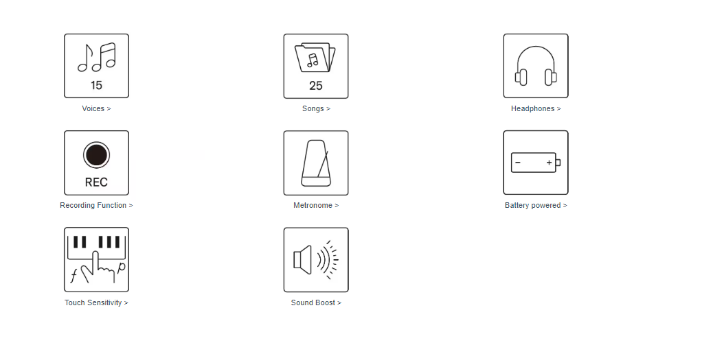 A 76-key keyboard (a conventional piano has 88 keys) that allows you to perform piano pieces with greater authenticity, without requiring much space. Although the keys have the same box shape as those on a piano, the keyboard has a lighter feel that makes it easy for beginning pianists to start, rather than the weightier feel of a standard piano keyboard. You can also use headphones with the NP-35 if you are worried about disturbing those around you with your playing.