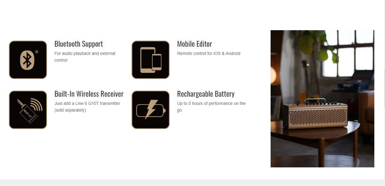 Built-in Line 6 wireless receiver is compatible with the Line 6 G10T transmitter (sold separately)