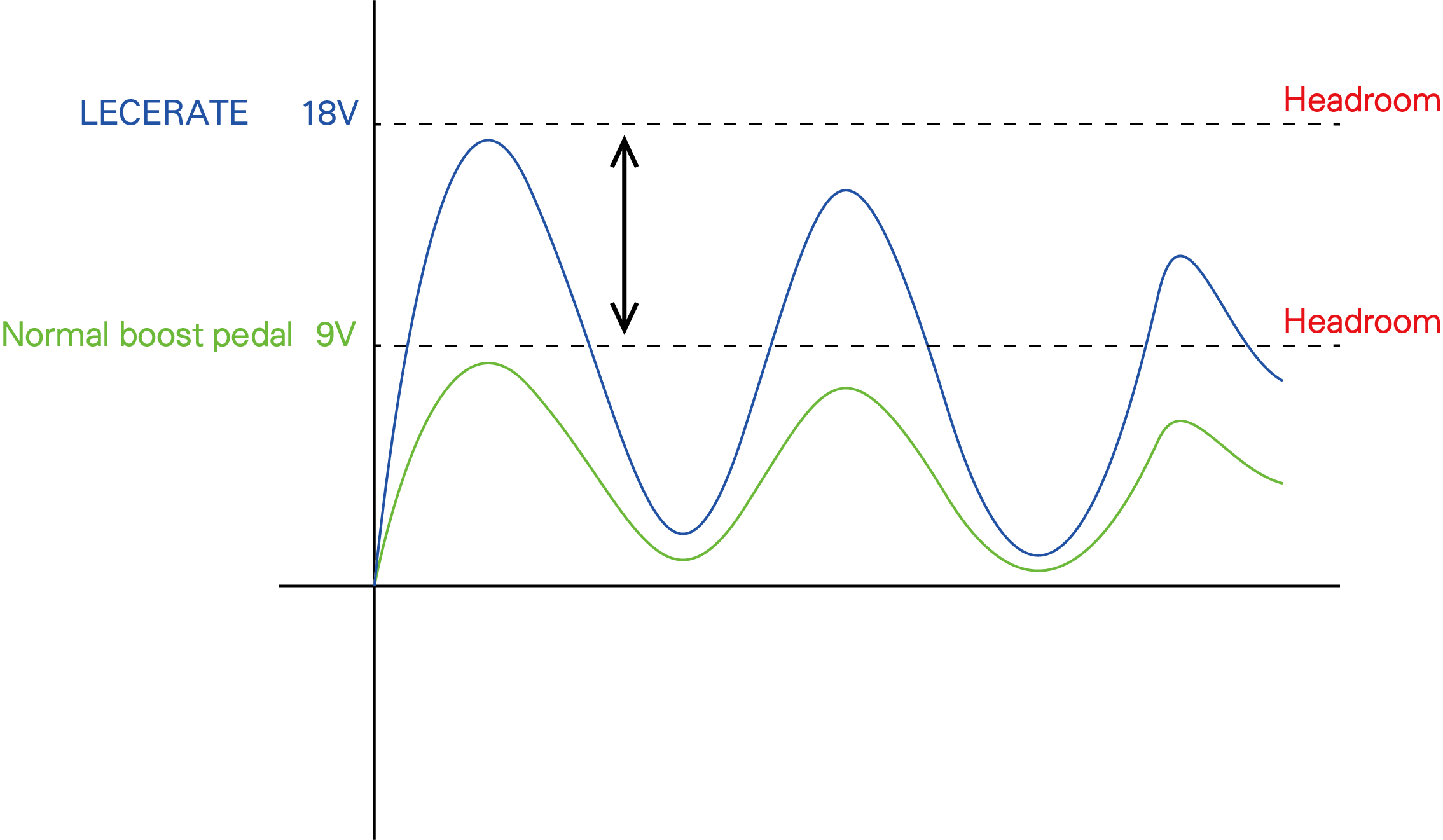 Lacerate has an integrated voltage-doubler which automatically changes 9V to 18V giving you ginormous headroom and dynamic.