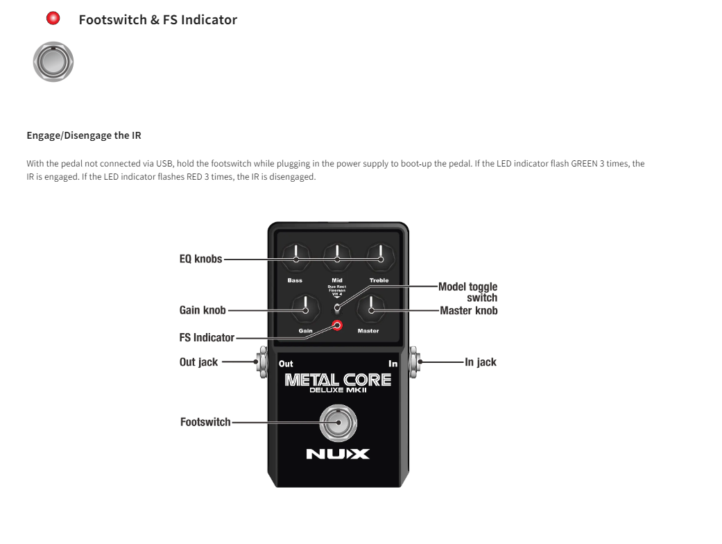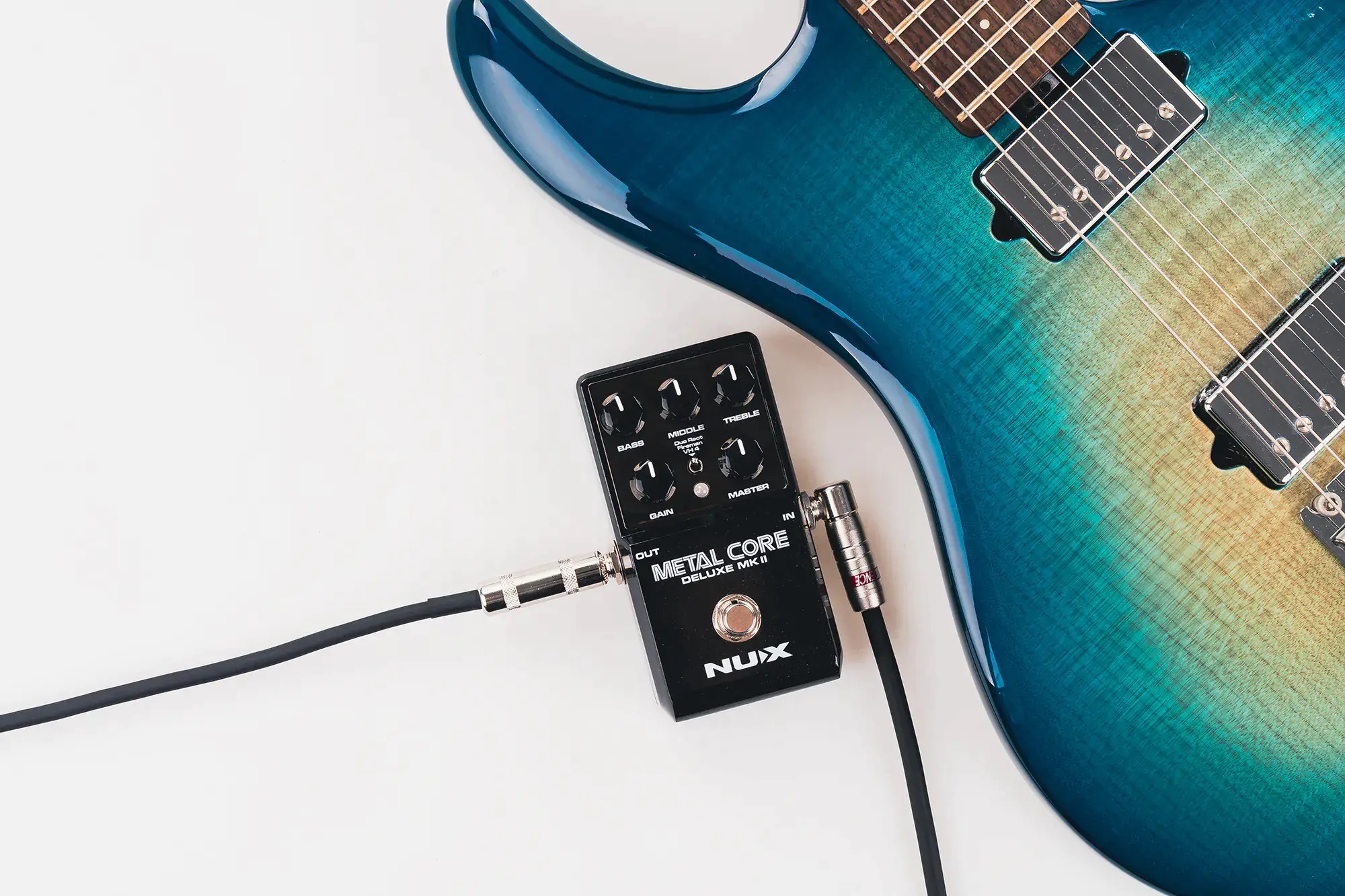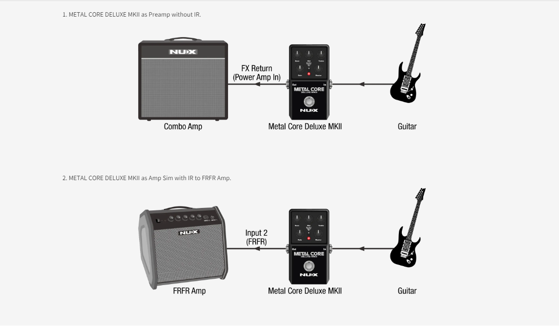 The NUX METAL CORE DELUXE MKII is a high gain preamp pedal with 3 distinctive high gain amp models including the Duo Rect, Fireman, and VH 4. You can select these models via the 3-way toggle switch.