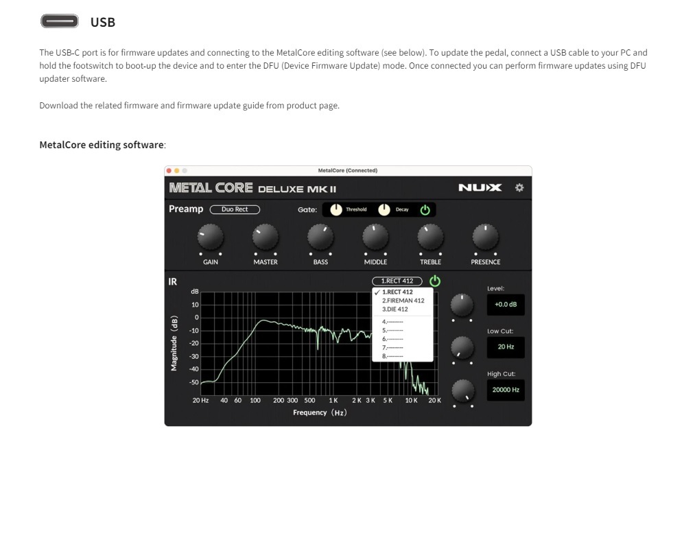 You can tweak the parameters and load 3rd party IRs through MetalCore editing software. Connect the USB cable to the pedal and PC, open the editing software, and that’s it. Make the tone all about you. The METAL CORE DELUXE MKII offers you 5 user slots to load 3rd party IRs. (4~8) It supports 512 samples resolution.