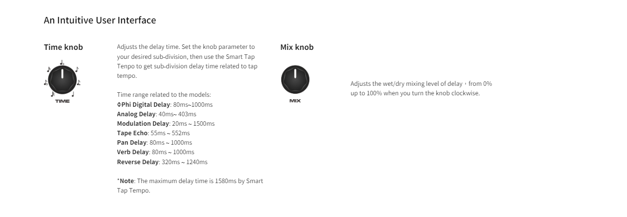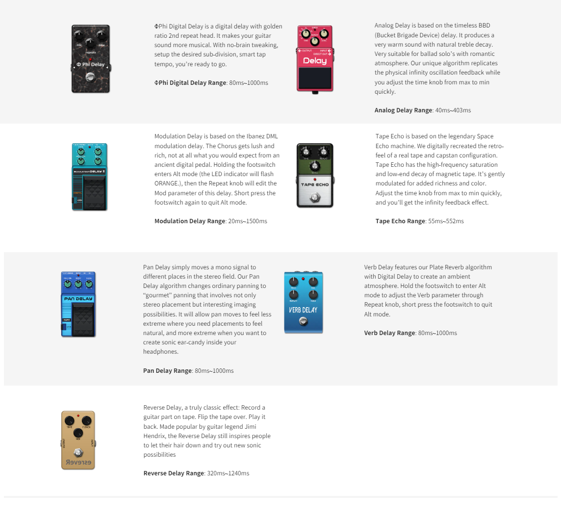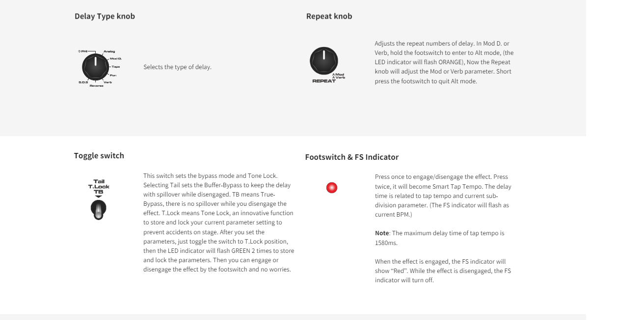 Modulation Delay: Lush and rich chorus with digital delay. (20ms~1500ms)