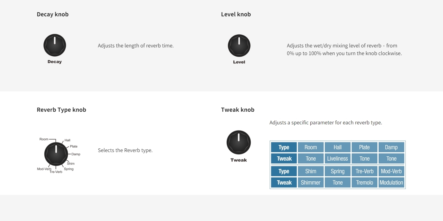 8 different types including Room, Hall, Plate, Damp, Shim, Spring, Tre-Verb and Mod Verb. You can select the reverb type by using the Type knob.