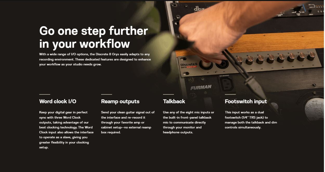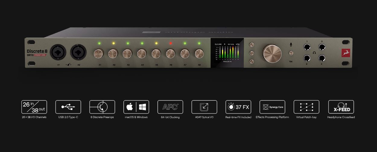 The Discrete 8 Oryx brings our latest innovations into a powerful, affordable studio hub for producers, engineers, and bands. Built for multi-instrument recording and hybrid workflows, it combines pristine conversion and clocking, console-grade preamps, real-time FX processing, advanced headphone tools, and expansive routing — all in one rack unit.