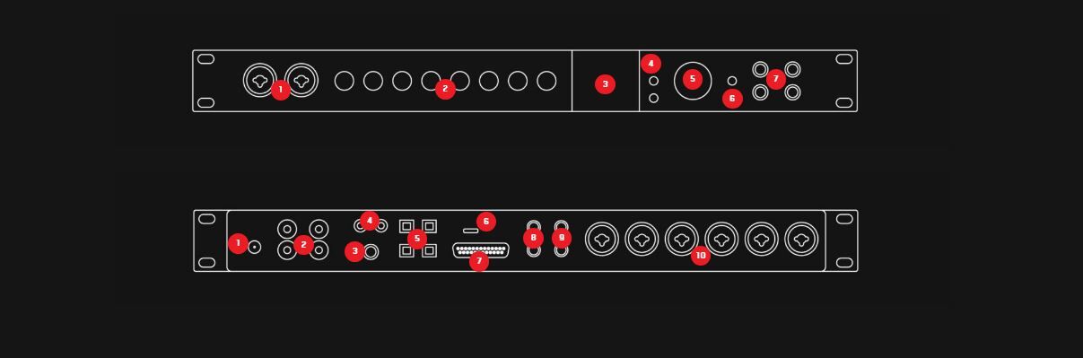 All eight inputs are DC-coupled and support both XLR and line-level TS/TRS connections, while the two front-panel inputs can also be switched to Hi-Z for direct instrument recording.