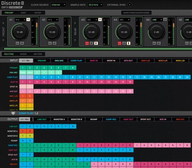 A redesigned software control panel puts efficiency and flexibility at your fingertips, offering a sleek, intuitive layout that adapts to your workflow. Explore the quick drag-and-drop routing, simultaneous operation of all digital and analog ports, and direct low-latency monitoring with onboard effects. This software upgrade significantly streamlines operation and expands the creative control available within the Discrete 8 Oryx.