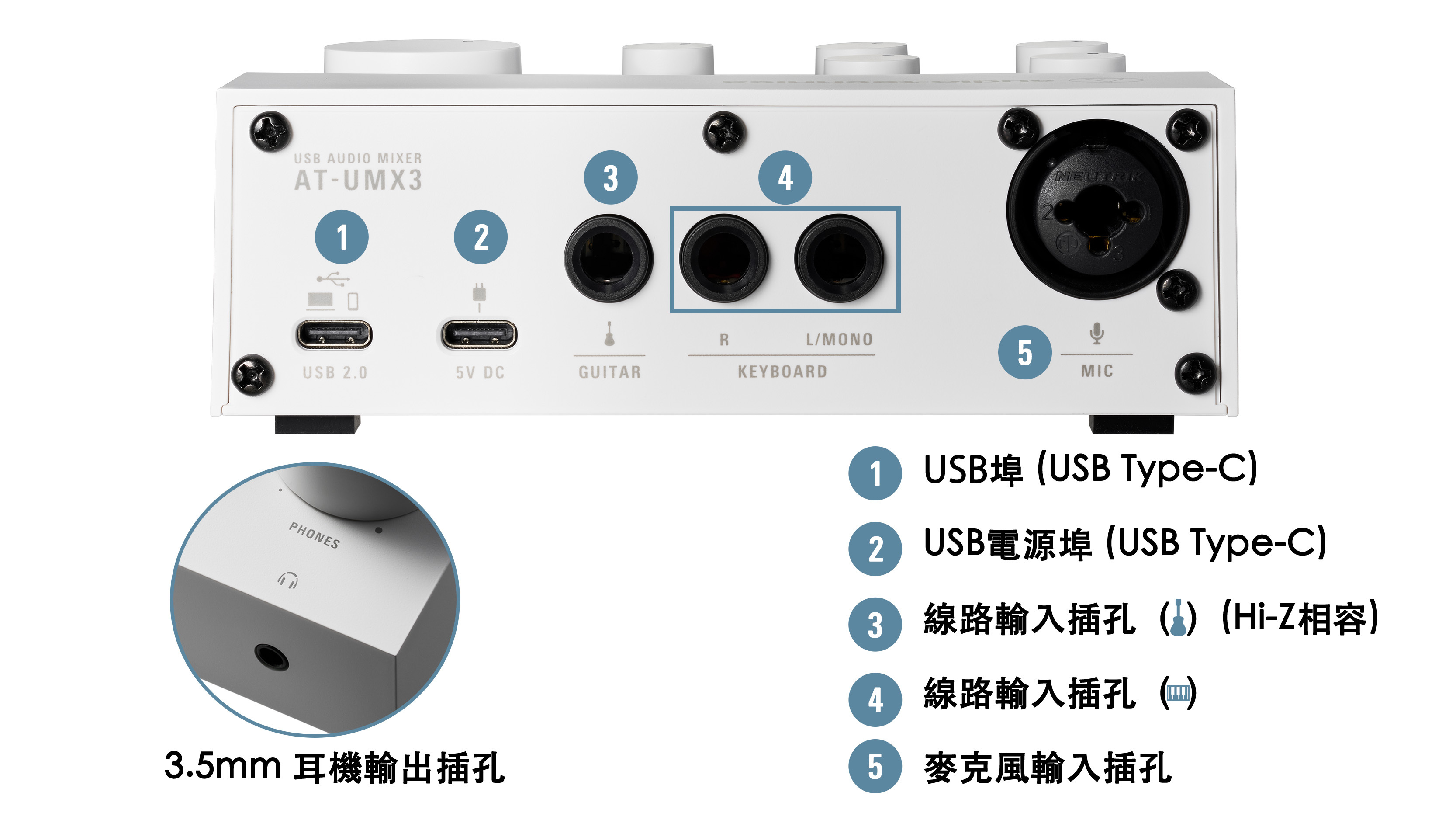 AT-UMX3 WH是一台小巧而功能豐富的小型USB混音器,無論是直播新手還是資深創作者,都能輕鬆上手,實現專業級的音訊製作。採用取樣率達192kHz/24bit的A/D轉換器,即插即用操作,可輕鬆連接至電腦或智慧型手機,讓混音製作變得簡單流暢。