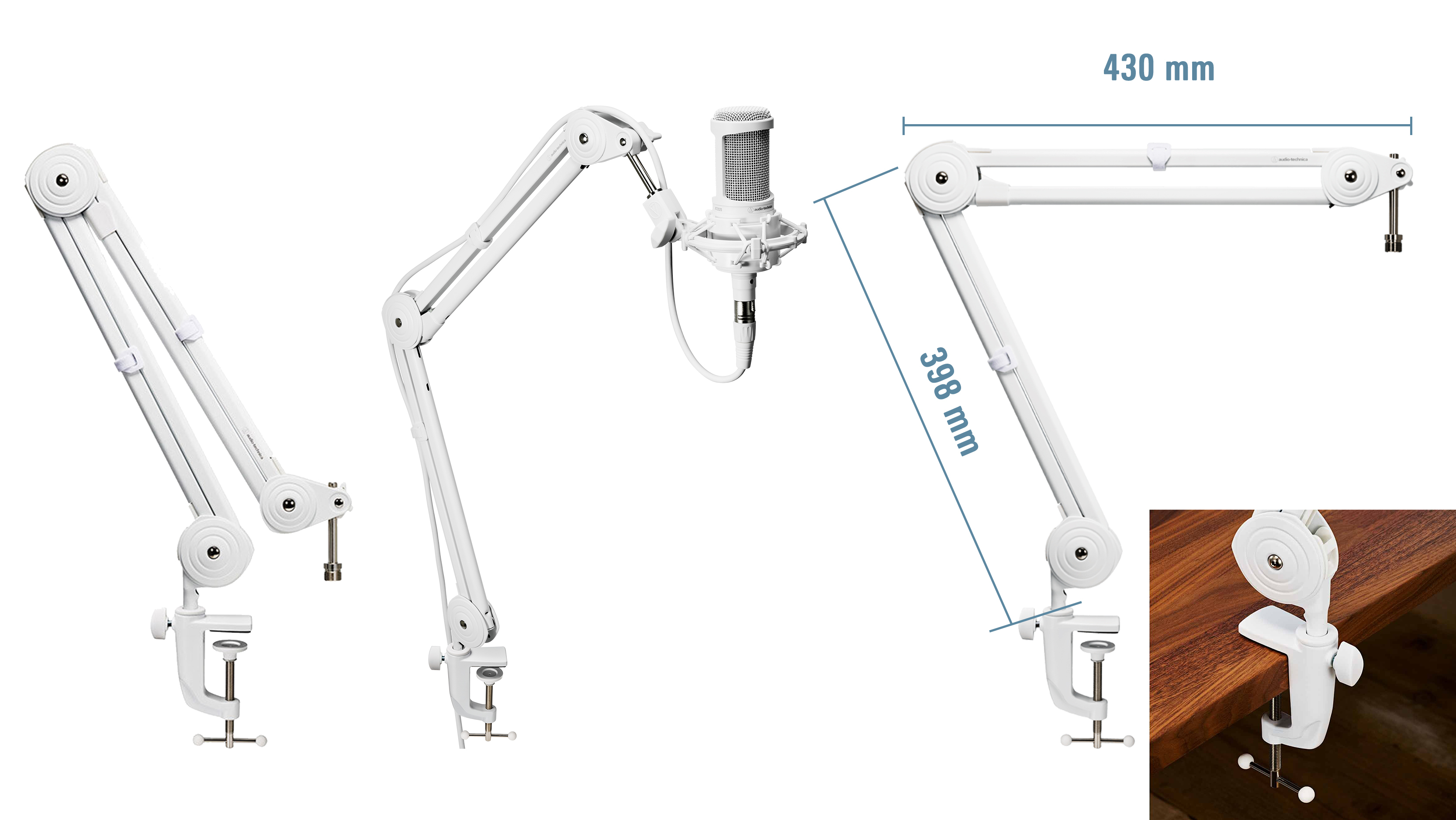 AT8700J WH 的承重能力達 2 公斤,兼容多種麥克風規格。夾具可安裝於厚度達 50 mm 的桌板上,安裝方式簡單。隨附固定線材用的魔鬼氈束線帶,方便整理線材,讓桌面維持整潔有序。此外,支架支援常見的 5/8 吋螺紋接頭,能與多款麥克風搭配,為您的錄音與創作提供穩定的支援。