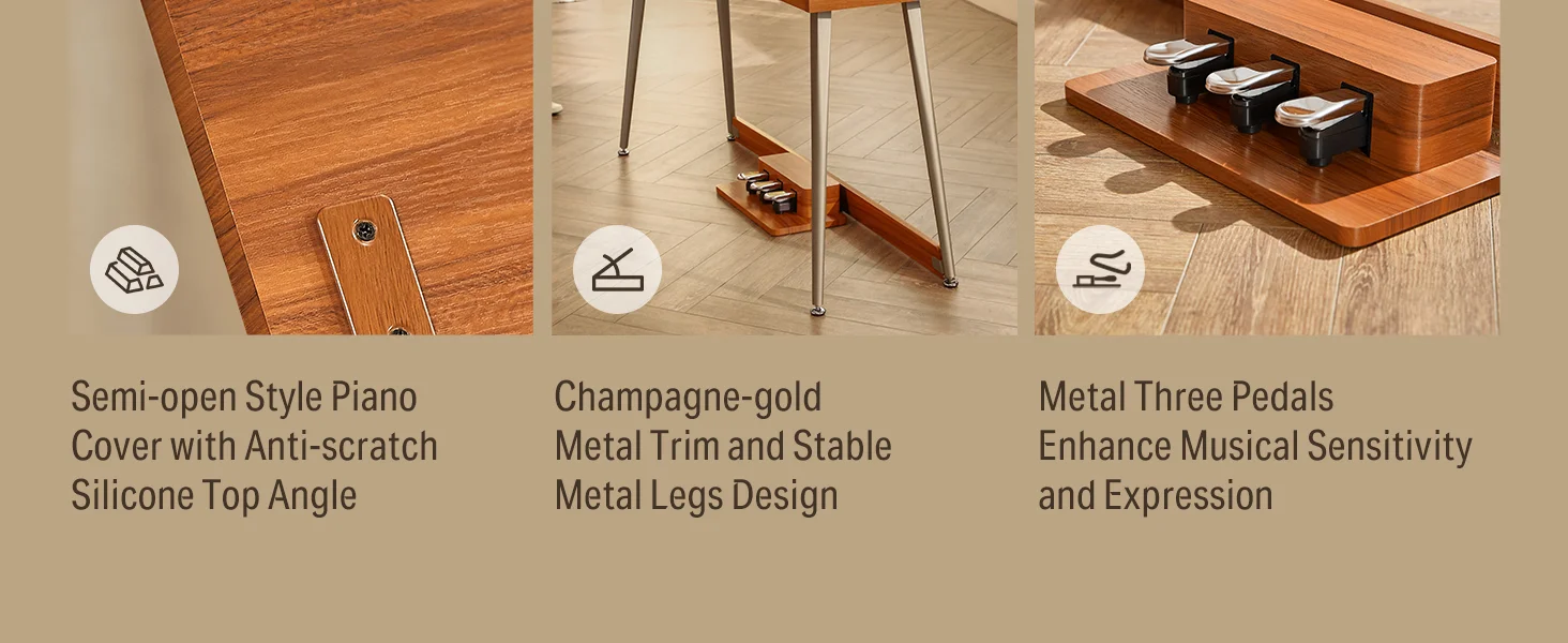 配備與傳統鋼琴相同配置的金屬三踏板,且可拆卸安裝,穩固設計解決市面滑動問題。