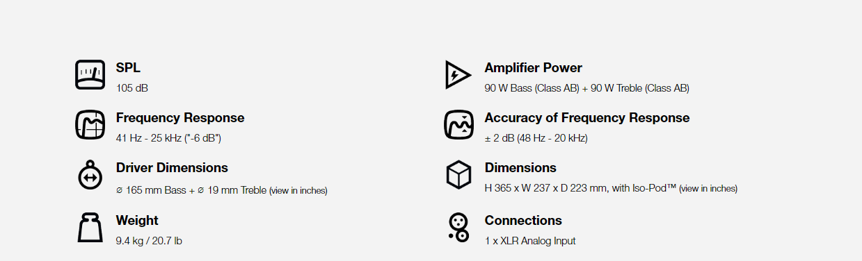The choice of recording professionals the world over, the 8040B’s pristine performance extends to an SPL of 105 dB and reaches right down to 41 Hz. This is a nearfield monitor that can provide truthfulness and energy in equal measures.