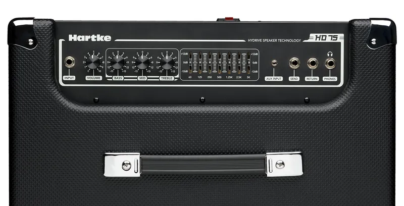 Packed with professional features, the HD75 combo is designed to be easy to use and reliable for players of all levels. The combo offers volume, bass, mid, and treble controls on its top-mounted amp panel, as well as a 7-band graphic EQ for easy tweaking. It features a full effects loop, as well as a 1/8" stereo auxiliary input for playing along with your favorite tunes via an MP3 player, and a 1⁄4" headphone output for more intimate practice sessions. In addition, the HD75 features a built-in limiter to keep the amp running at safe levels. Finally, its rugged enclosure is stylishly finished with a sleek, perforated metal grille and molded strap carry handle. With the exceptional sound of HyDrive speakers in a durable, highly portable enclosure, the Hartke HD75 bass combo is able to perform at levels far beyond ordinary bass combos.