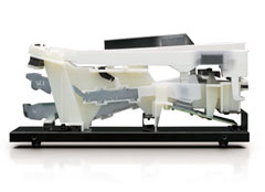 CN-39鍵盤除了有小觸鍵(let–off feel)的效果外,每個琴鍵裡面 增加砝碼裝置,用力彈奏時手指會確實感受到彈奏力道的抗力, 溫和彈奏時,手指會感覺鍵盤快速落下與啪答聲。不只是觸鍵, 音量與音色在用力彈奏時有「燦爛的聲音」;輕輕觸鍵時有「溫和 的聲音」等豐富的變化。這是因為低音與高音部音鎚重量不 樣,鍵盤觸鍵低中高音部有不一樣的效果。3個感應器的效果是 按下鍵盤,如果手指中途不離開的上下彈奏時,聲音不會中斷。