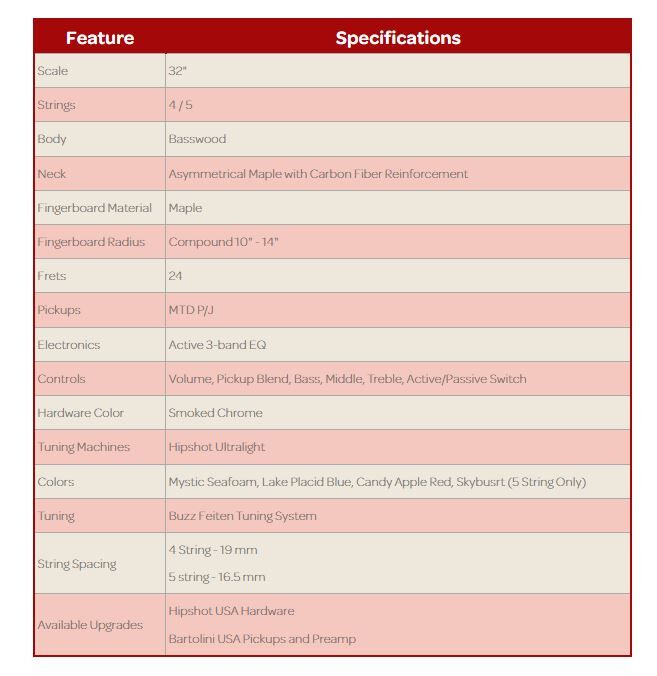 Four string models can be upgraded with Hip Shot tuners and bridge. Bartolini pickups available in Summer 23’.