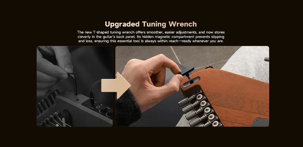 Stay pitch-perfect with the new built-in chromatic tuner. Plus, never lose your gear again with the hidden magnetic compartment that securely stores the included T-wrench.