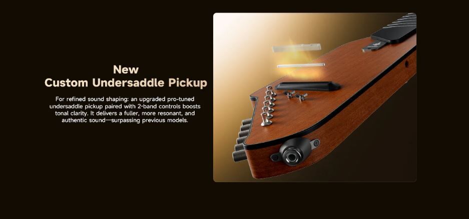 Equipped with the upgraded HPS-II Preamp and custom undersaddle pickup. Delivers a faster dynamic response and a richer, more natural acoustic tone for headphones or amplifiers.