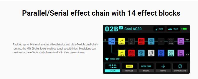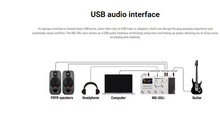 The MG-50Li features pro-grade I/Os tailored for live use: two effect loops for your favorite pedals, stereo XLR outputs for direct mixer linking, and MIDI in/out for seamless connection to your MIDI control gear.