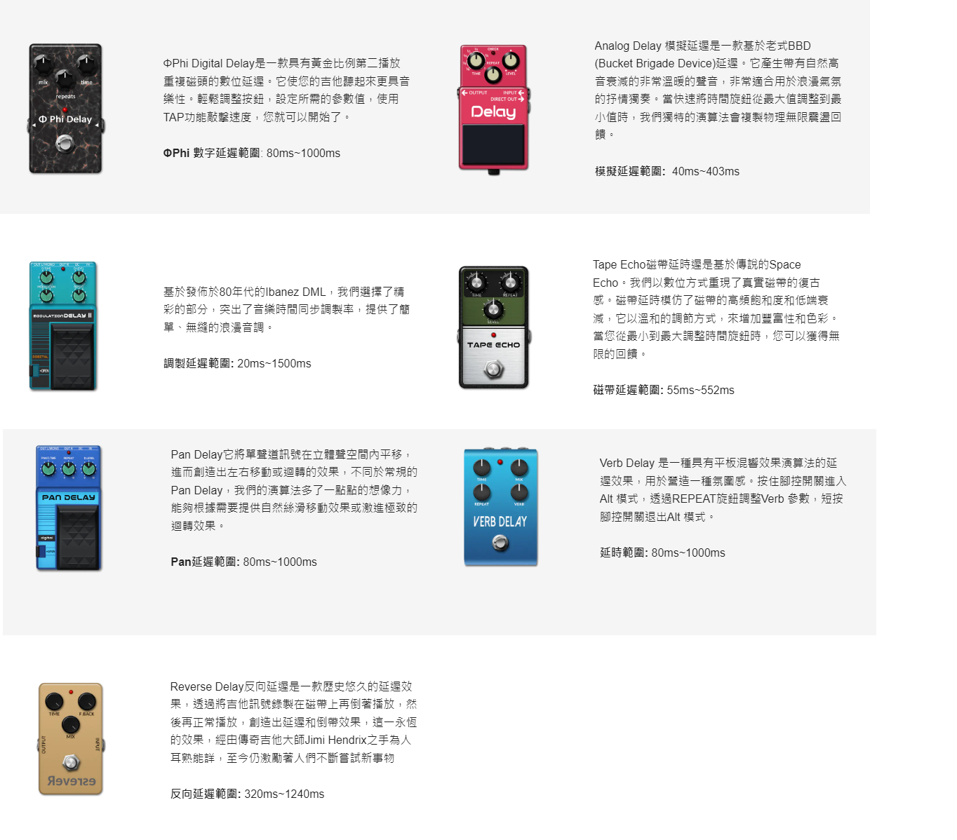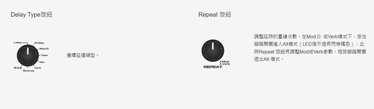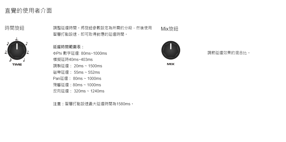 ΦPhi 數位延遲: 具有黃金比例第二播放重複磁頭的數位延遲。 (80ms~1000ms)